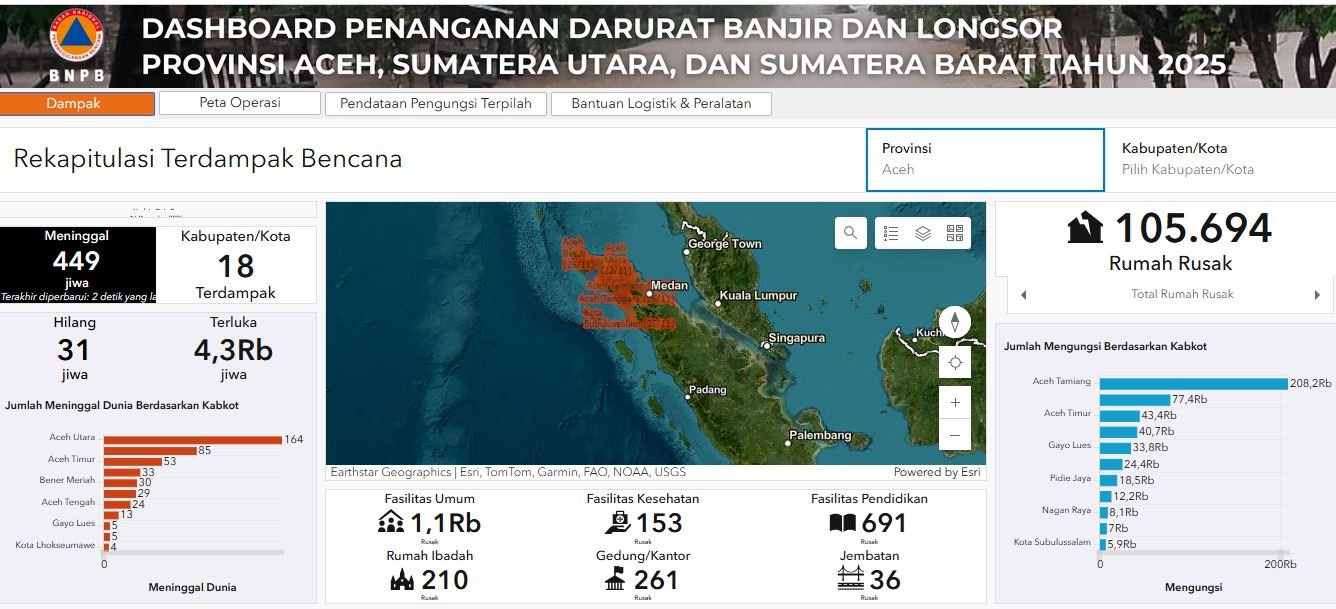 Foto Caption: Peta dampak menunjukkan 18 kabupaten di Aceh terdampak banjir dan longsor sepanjang tahun 2025.