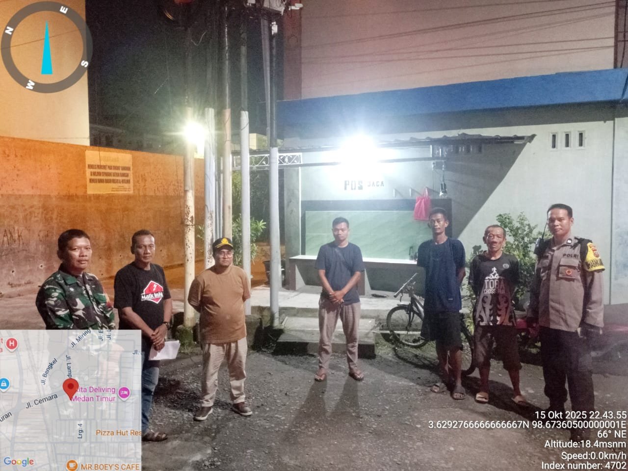 Medan | Babinsa Koramil 0201-02/MT Serda Setiawan melaksanakan kegiatan posko malam dan menyambangi poskamling bersama unsur Tiga Pilar di wilayah Kelurahan Pulo Brayan Darat II, Kecamatan Medan Timur, pada Rabu malam (15 Oktober 2025). Kegiatan ini merupakan upaya bersama dalam menjaga keamanan dan ketertiban lingkungan di wilayah binaan agar tetap kondusif.