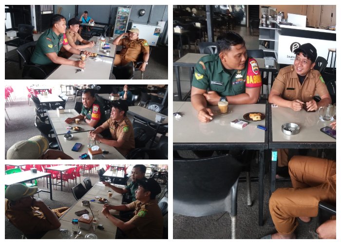 Foto Caption: Babinsa Tanjung Sari Serda Agus K melaksanakan Komsos bersama Kepling di Warung Kopi Bumikala Jalan Setia Budi Pasar 2, Medan Selayang.