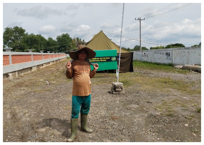 Ia tampak membawa peralatan sederhana seperti sapu dan cangkul untuk membersihkan area sekitar posko. Dengan penuh semangat, ia menyapu halaman dan membantu mengangkat sampah ke tempat pembuangan.