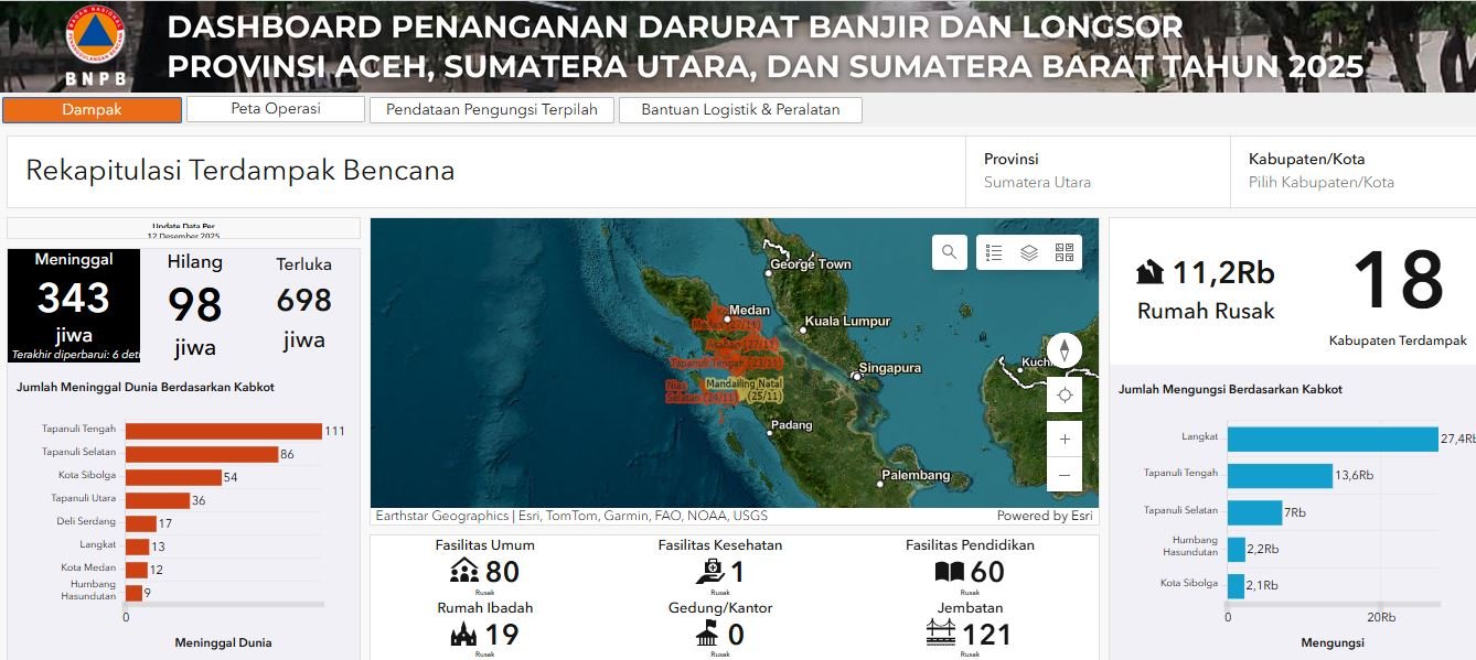 Caption Foto: Dashboard BNPB menunjukkan data resmi korban meninggal, hilang, terluka, serta kerusakan fasilitas umum, fasilitas kesehatan, pendidikan, rumah ibadah, gedung kantor, jembatan, dan rumah penduduk di 18 kabupaten terdampak Sumatera Utara, Jumat 12 Desember 2025.