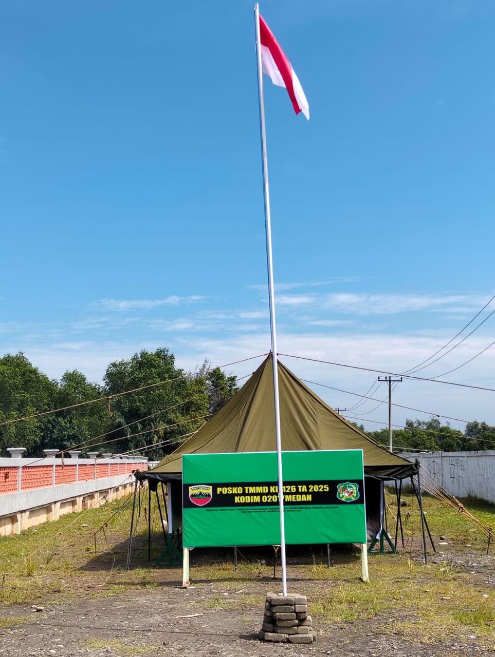 Pemandangan sederhana namun bermakna itu menggambarkan kuatnya tekad TNI dan Pemko Medan dalam membangun wilayah dan mensejahterakan masyarakat. Tiang bendera berdiri gagah di depan tenda hijau Posko TMMD, menandakan kesiapan dan kedisiplinan satgas dalam menjalankan tugas, kemarin.