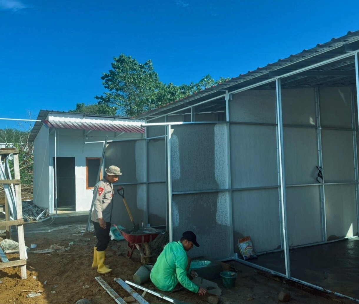 Dengan menggunakan sejumlah peralatan kerja seperti cangkul, sekop, dan beko sorong, personel Brimob bersama-sama mengerjakan pengecatan kamar mandi huntara yang saat ini telah mencapai progres sekitar 70 persen. Proses pengerjaan masih terus berlangsung dan ditargetkan dapat segera diselesaikan.