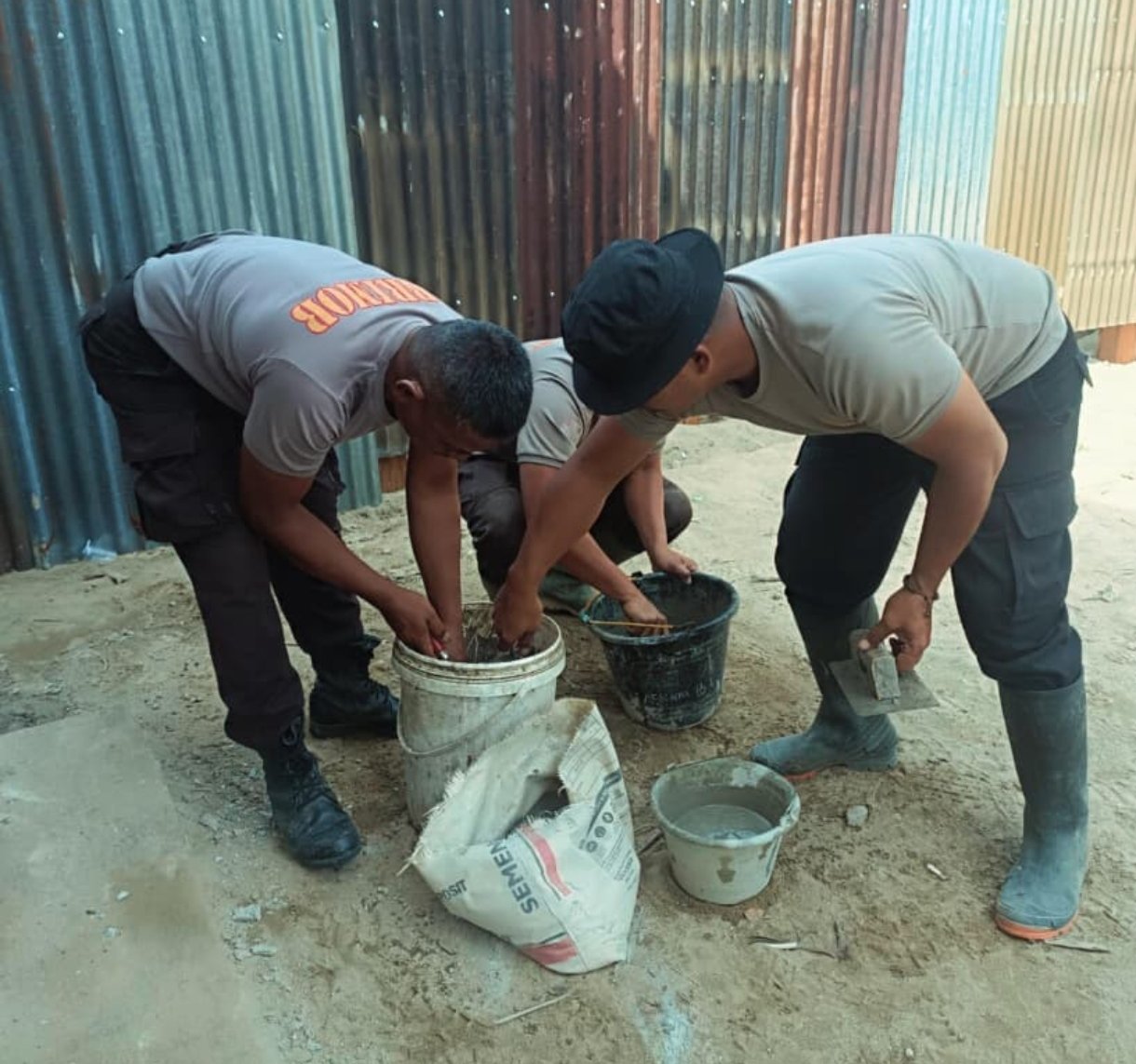 Dipimpin oleh Danton I Kompi 1 Batalyon C, IPTU Roy Sandri Pohan, S.H., personel Brimob melaksanakan finishing plester dinding rumah swadaya ke-11, sekaligus melakukan pembersihan sisa material di sekitar lokasi pembangunan agar lingkungan tetap tertata dan aman.