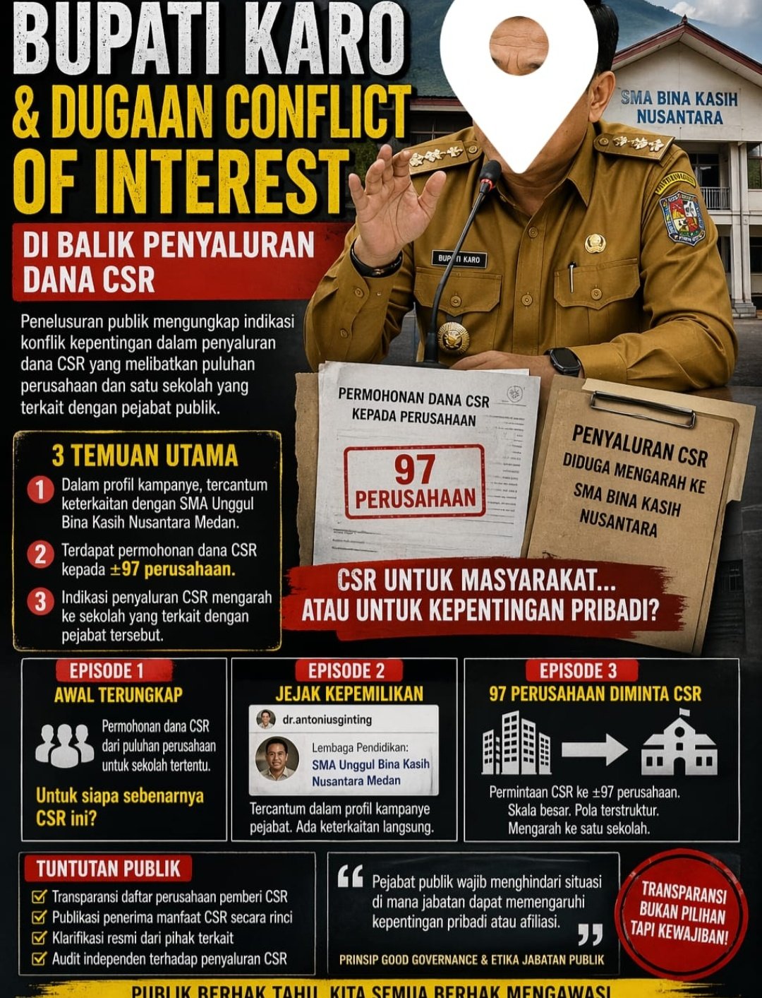 Secara administratif, surat itu memang menegaskan bahwa Pemerintah Kabupaten Karo tidak menerima ataupun mengelola dana CSR tersebut. Jadi secara teori, pemkab hanya seperti “mak comblang,” mempertemukan perusahaan baik hati dengan yayasan yang—kebetulan sekali—punya hubungan dekat dengan sang kepala daerah.