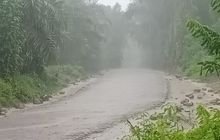 Genangan air juga terlihat mengalir ke bagian badan jalan yang posisinya lebih rendah.