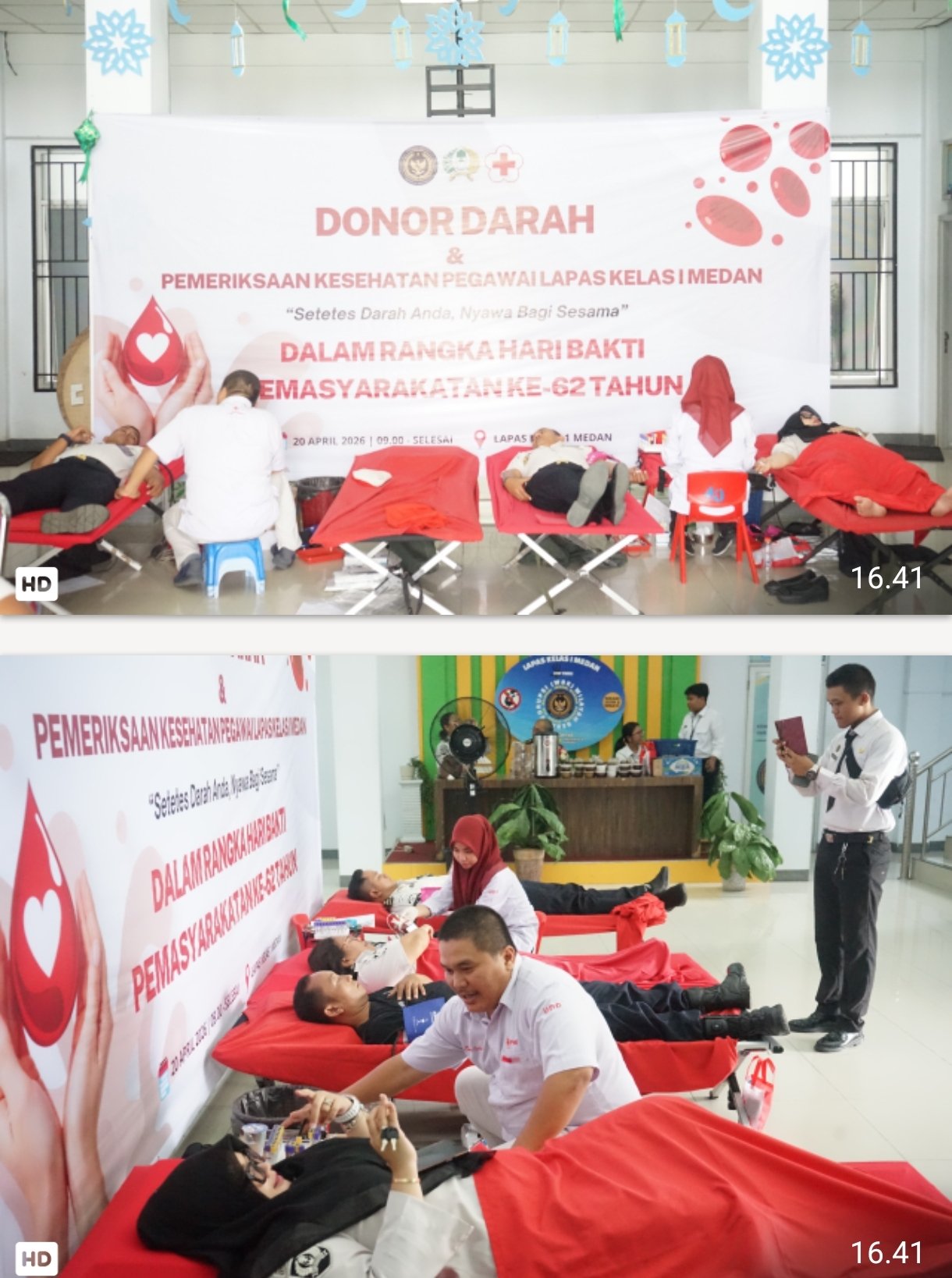 Kegiatan yang dilaksanakan pada Senin, 20 April 2026 mulai pukul 09.00 WIB hingga selesai ini bertempat di Lobby Gedung I Lapas Kelas I Medan. Kegiatan berlangsung dengan tertib dan mendapat antusiasme tinggi dari para pegawai yang berpartisipasi secara sukarela dalam mendonorkan darah serta mengikuti pemeriksaan kesehatan.
