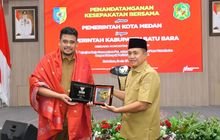Menutup kegiatan, Bupati Batu Bara Zahir bersama Walikota Medan Bobby Afif Nasution saling bertukar cinderamata sebagai tanda hubungan kerjasama yang baik.(Subari)