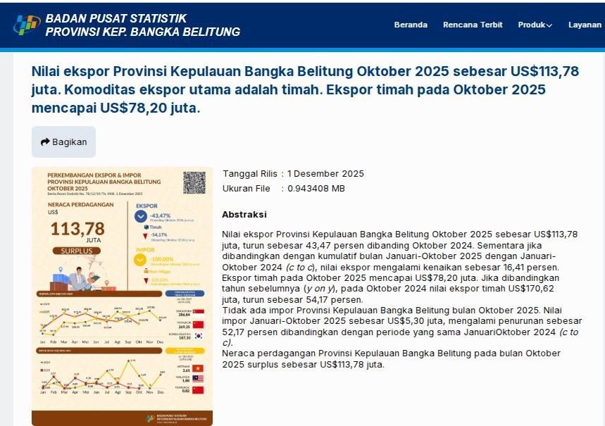 matabangsa.com – Medan | Badan Pusat Statistik (BPS) Provinsi Kepulauan Bangka Belitung mencatat nilai ekspor daerah pada Oktober 2025 mencapai US$113,78 juta. Angka tersebut mengalami penurunan tajam sebesar 43,47 persen dibandingkan periode yang sama Oktober 2024. Meski menurun secara tahunan, kinerja ekspor Bangka Belitung masih menunjukkan daya tahan pada sektor unggulan, khususnya komoditas timah yang tetap menjadi penyumbang terbesar nilai ekspor daerah.