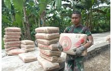 Terlihat para anggota Satgas TMMD bahu-membahu bersama warga untuk mengangkat semen secara manual. Semen-semen tersebut akan digunakan untuk mengecor jalan sasaran fisik pada TMMD.