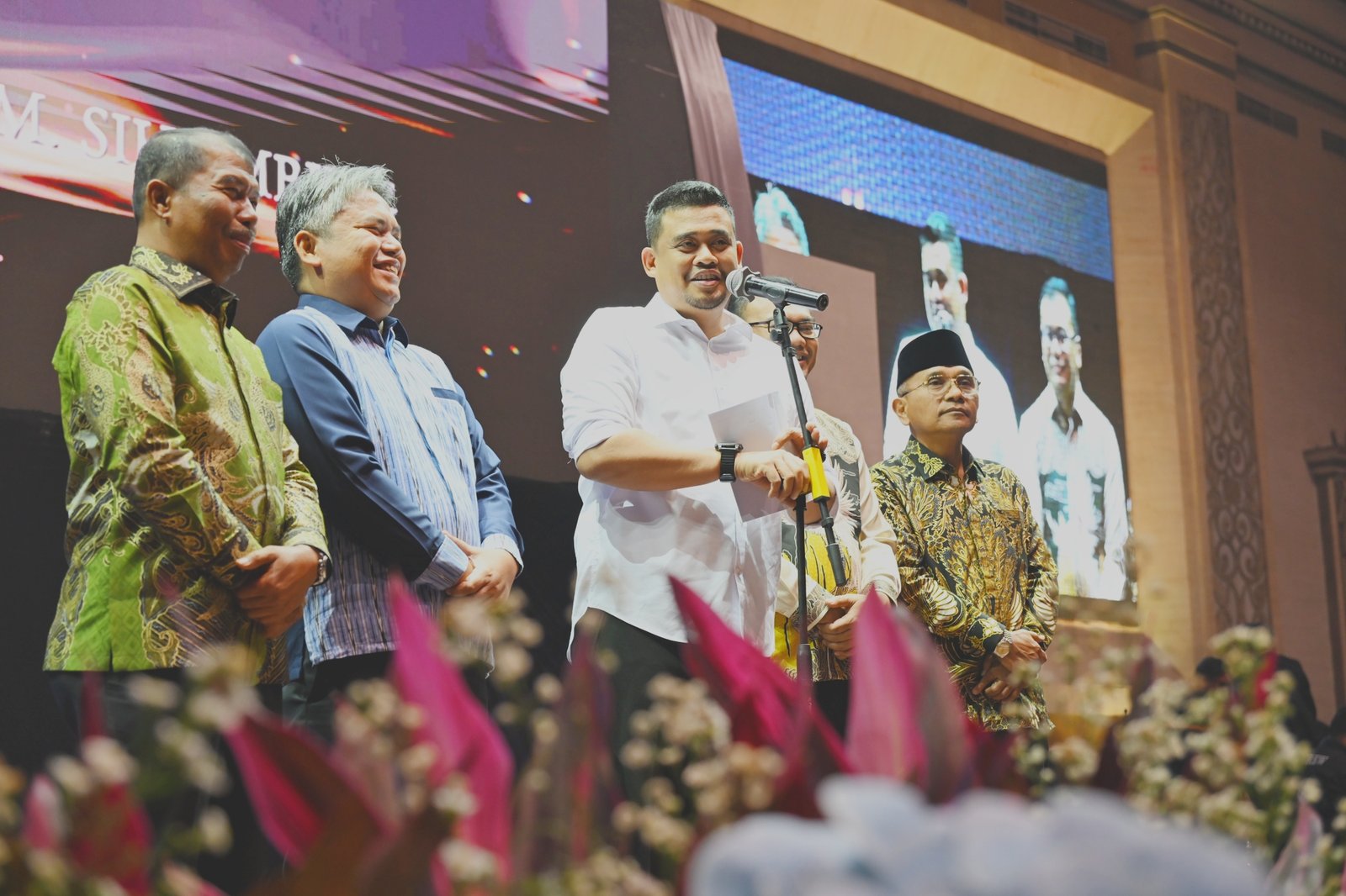 MEDAN – Gubernur Sumatera Utara (Sumut) Muhammad Bobby Afif Nasution menghadiri perayaan hari ulang tahun ke-75 tokoh masyarakat Rustam Efendi (RE) Nainggolan di REGALE International Convention Centre, Jalan Adam Malik Medan, Jumat (21/11/2025) malam.