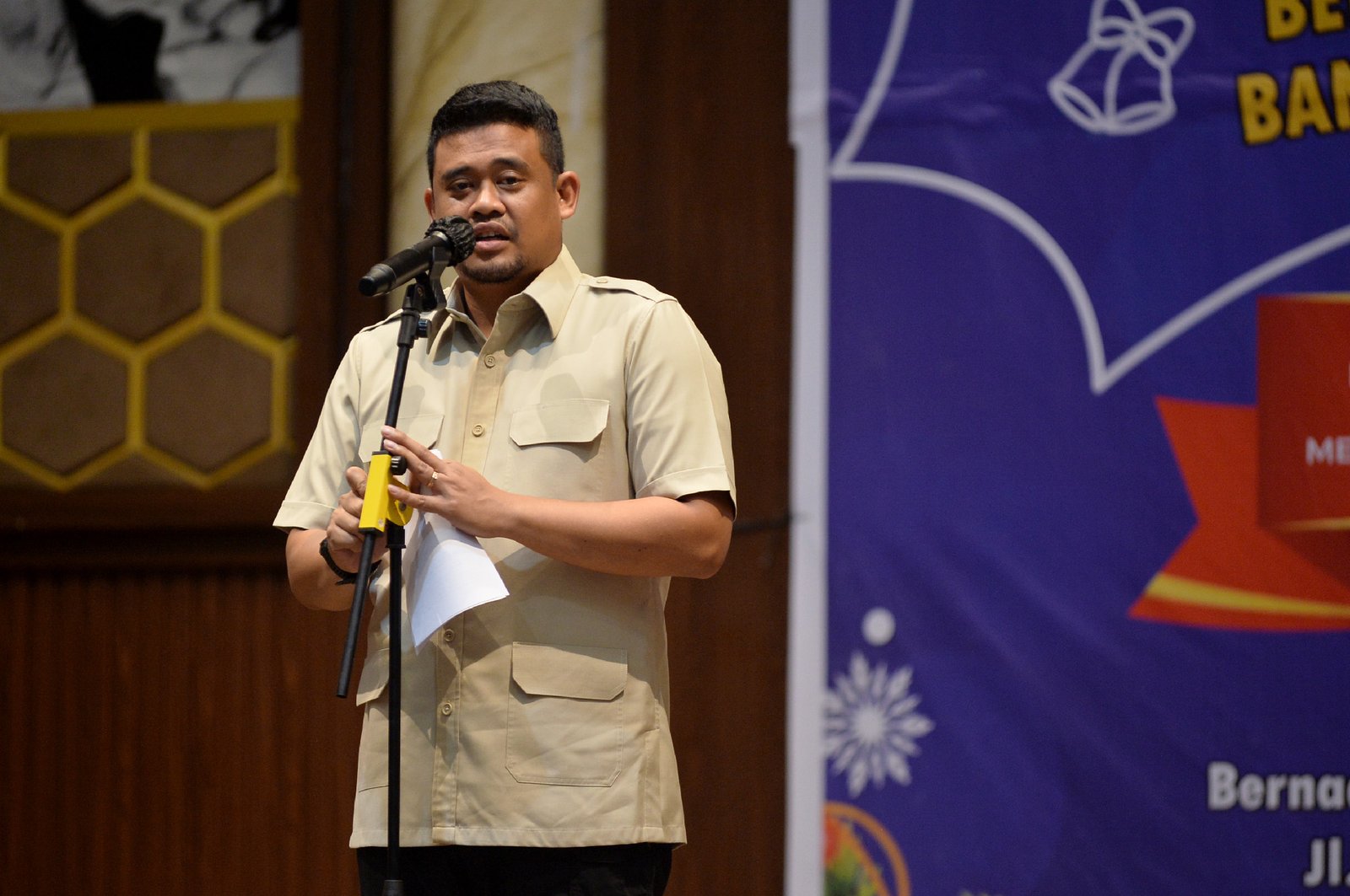 MEDAN – Gubernur Sumatera Utara (Sumut) Bobby Nasution menghadiri Perayaan Natal Gerakan Angkatan Muda Kristen Indonesia (GAMKI) Sumut yang dirayakan bersama warga korban banjir dan longsor, di Bernada Hall, Jalan Jamin Ginting No. 181, Medan, Selasa (23/12/2025) malam.