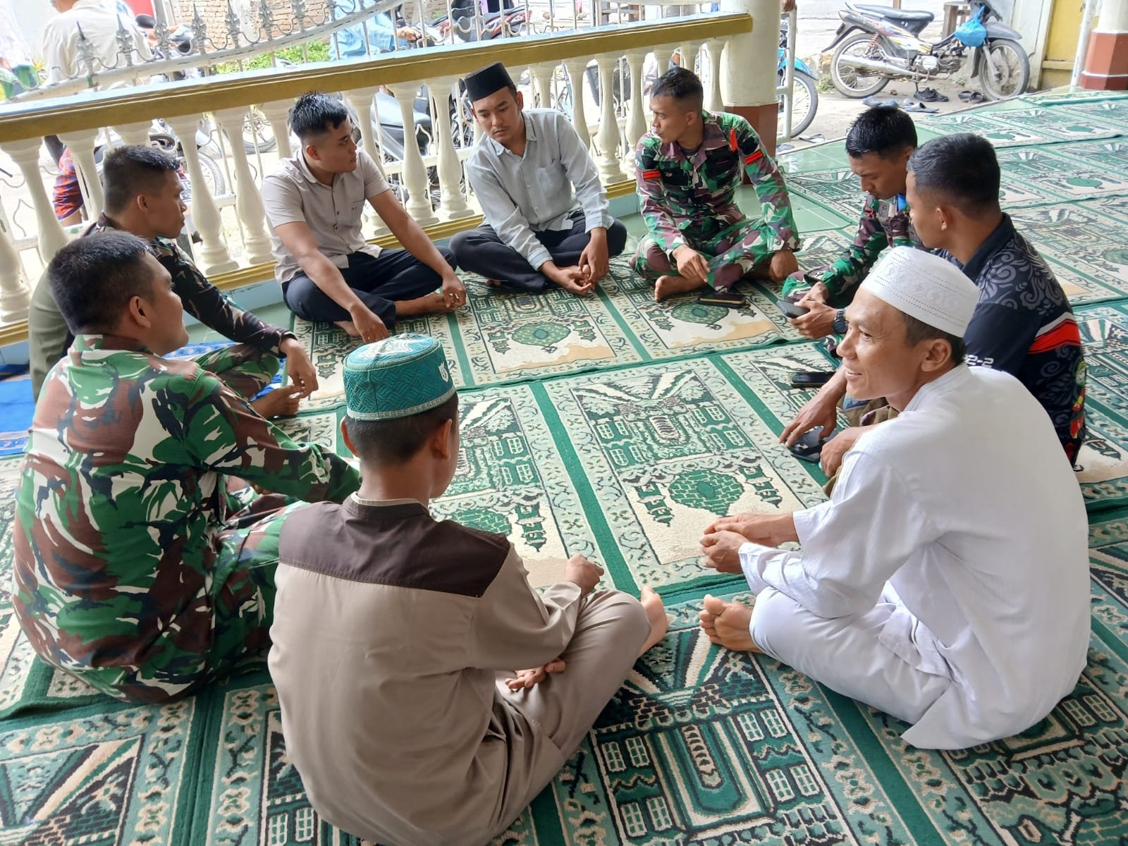 Beberapa prajurit terlihat berbincang santai dengan warga dan pemuda sambil duduk melingkar di atas sajadah. Suasana akrab itu menjadi bukti kuatnya hubungan antara TNI dan rakyat.