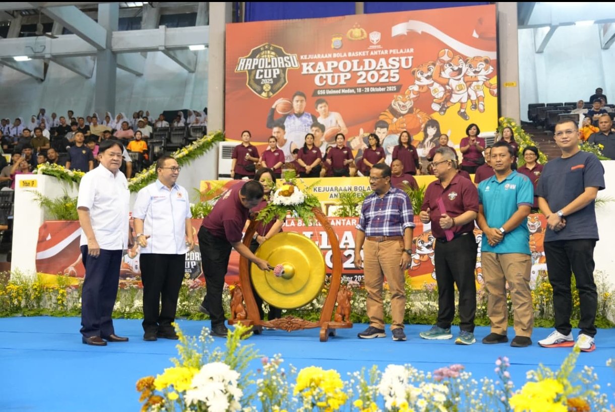 matabangsa.com-Medan: Suasana Gedung Serba Guna Universitas Negeri Medan (UNIMED) tampak meriah pada Sabtu (18/10), saat Kapolda Sumatera Utara Irjen Pol. Whisnu Hermawan Februanto secara resmi membuka Kejuaraan Bola Basket Antar Pelajar “Kapoldasu Cup 2025”.
