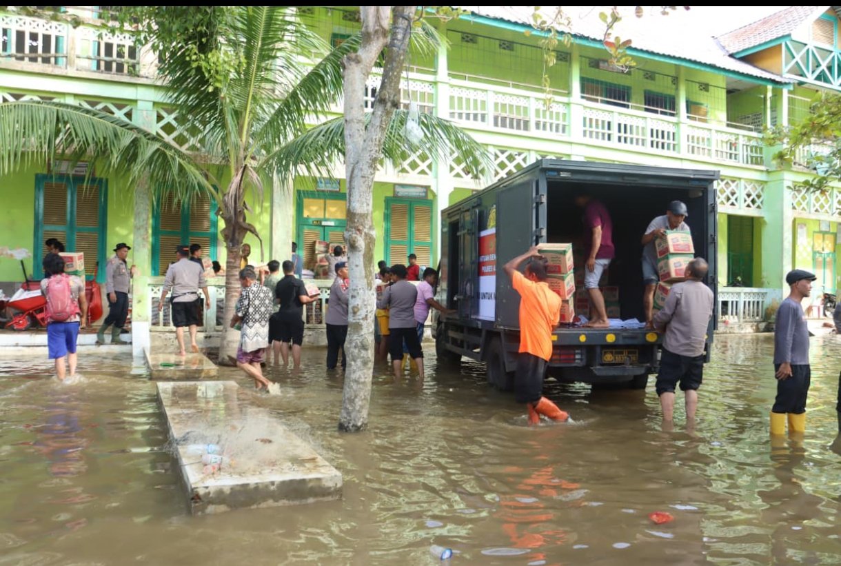 Bantuan Diserahkan untuk Warga dan Civitas IJM, adapun bantuan yang diberikan meliputi: 3 unit kereta sorong, 200 goni beras, 200 kotak mie instan, 200 papan telur, 3 truk tangki air bersih, bantuan diterima secara simbolis oleh Rektor IJM Dr. M. Soleh, S.HI., M.A., CPM, yang mewakili warga terdampak banjir dan menyampaikan apresiasi kepada jajaran kepolisian.