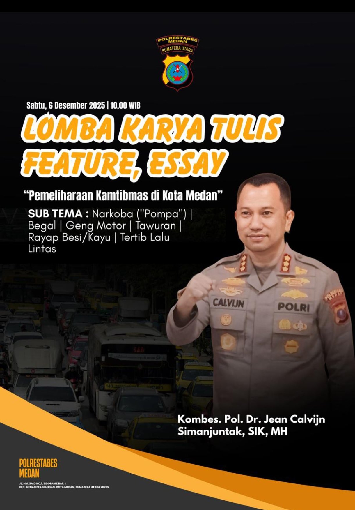 Dengan mengusung tema besar Harkamtibmas di Kota Medan, lomba ini mendorong peserta mengangkat isu yang saat ini menjadi fokus perhatian publik dan kepolisian, yakni narkoba, begal, geng motor, rayap besi/kayu, serta tertib lalu lintas. Melalui karya tulis yang informatif dan analitis, para jurnalis diharapkan dapat menyajikan konten edukatif yang mendukung terciptanya lingkungan aman di Kota Medan.
