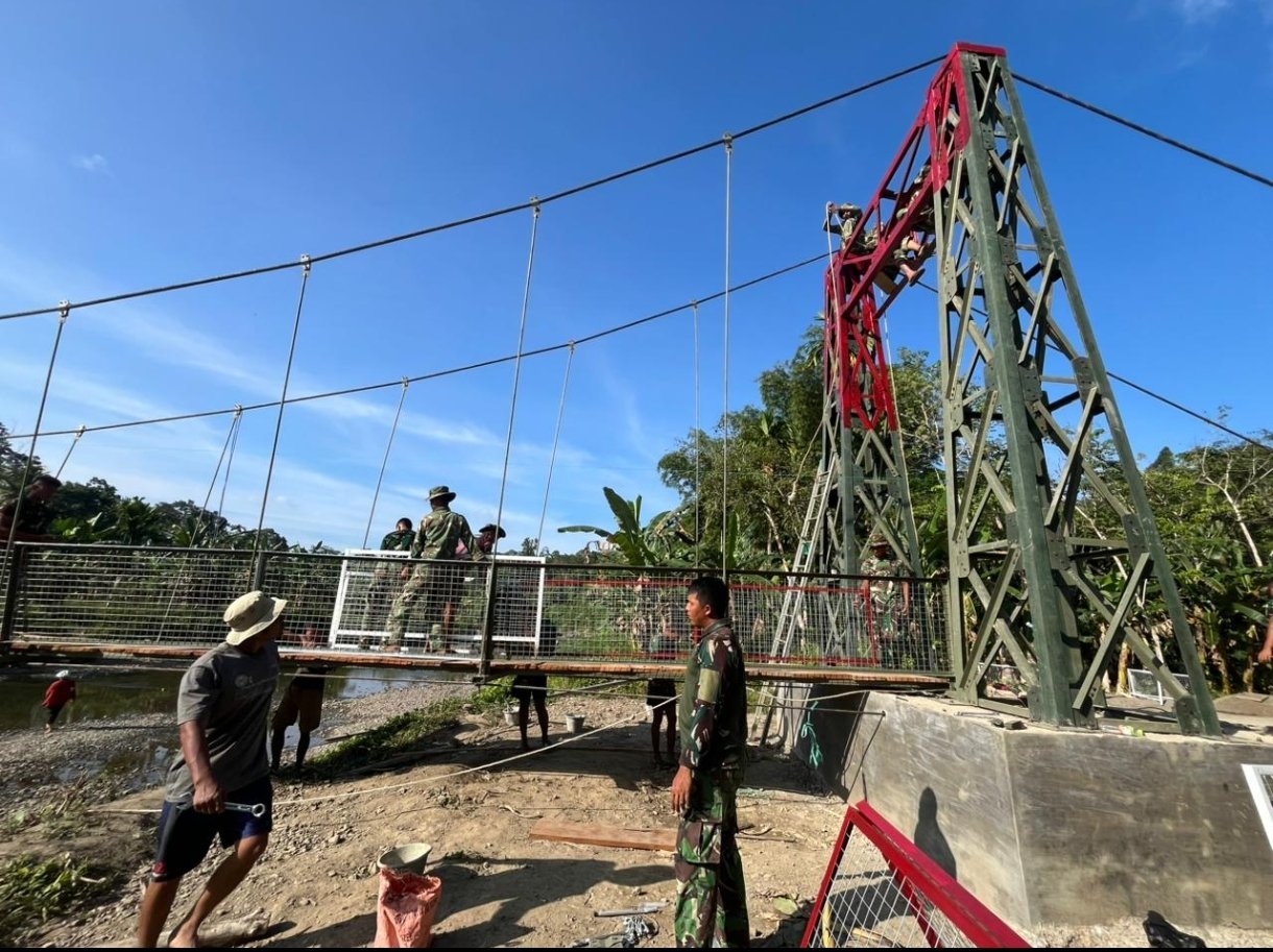 matabangsa.com-Nias Utara: Kodim 0213/Nias merampungkan pembangunan Jembatan Gantung di Desa Sanawuyu, Kec. Sawo, Kab. Nias Utara, Kamis (12/3/2026). Jembatan sepanjang 60 meter dengan lebar 1,5 meter tersebut dibangun untuk mempermudah akses masyarakat yang selama ini harus menyeberangi sungai saat keluar masuk kampung.