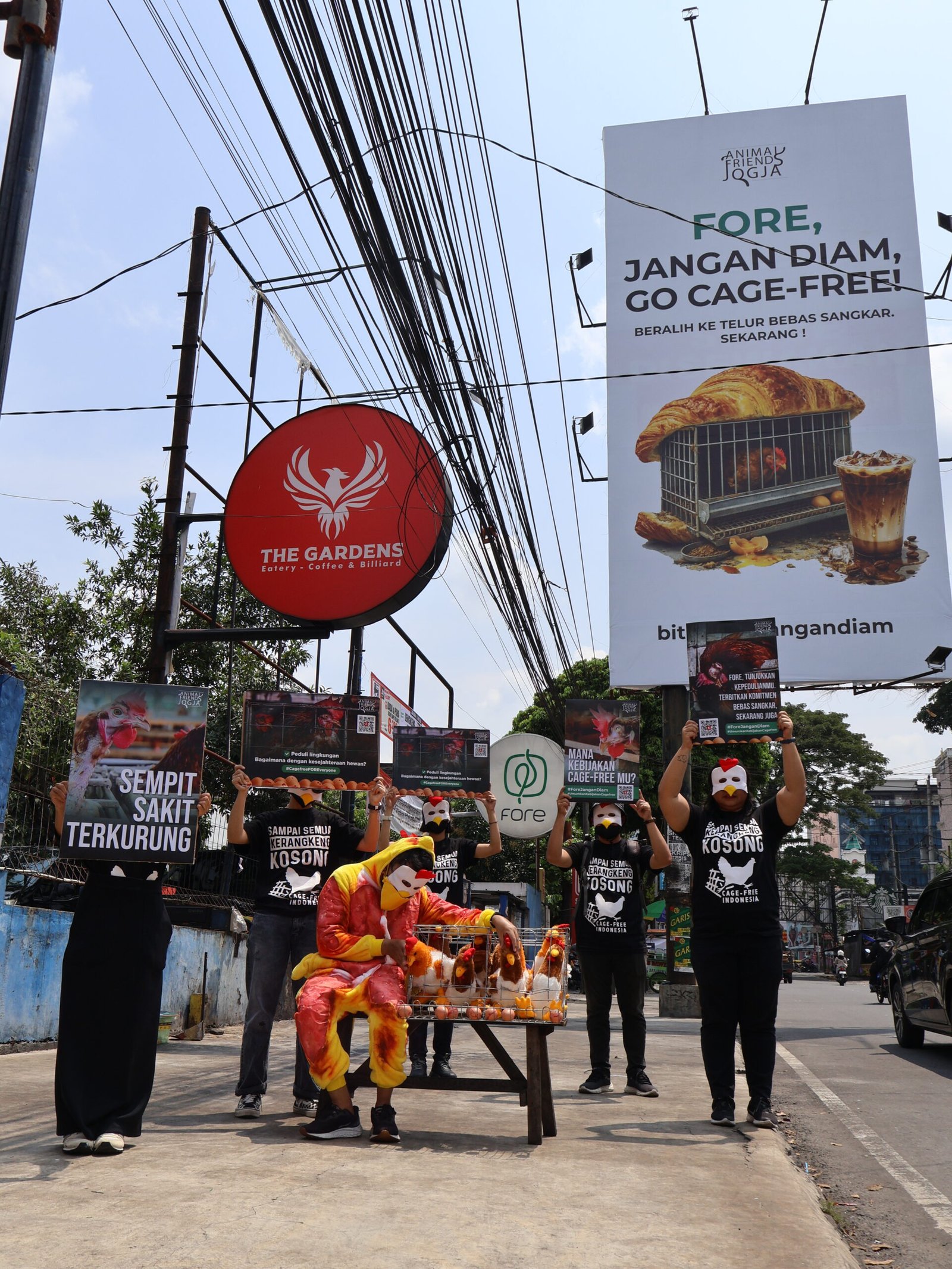Aksi dari Animal Friends Jogja ini datang dengan gaya yang cukup teatrikal. Ada poster, ada selebaran, dan tentu saja ada papan reklame yang dengan penuh percaya diri meminta: “Fore, Jangan Diam: Go Cage-Free!” Sebuah kalimat yang terdengar seperti ajakan sederhana, tapi ternyata cukup membuat industri kopi sedikit berkeringat.