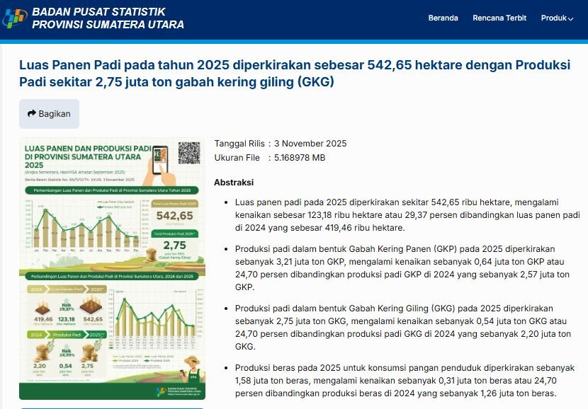 Tags: #BPSSumut, #PertanianSumut, #LuasPanenPadi, #ProduksiPadi, #GKP, #GKG, #ProduksiBeras, #KetahananPangan, #SumateraUtara,