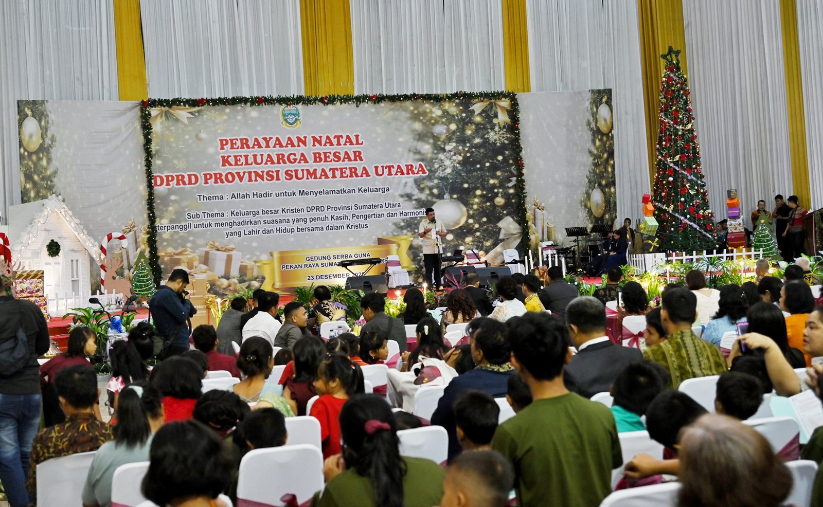 MEDAN – Gubernur Sumatera Utara (Sumut) Muhammad Bobby Afif Nasution menghadiri Perayaan Natal Keluarga Besar Dewan Perwakilan Rakyat Daerah (DPRD) Sumut yang digelar di Gedung Serbaguna Pekan Raya Sumatera Utara (PRSU), Jalan Gatot Subroto, Medan, Selasa (23/12/2025). Perayaan Natal berlangsung khidmat dan penuh kebersamaan dengan mengusung tema “Allah Hadir untuk Menyelamatkan Keluarga”.