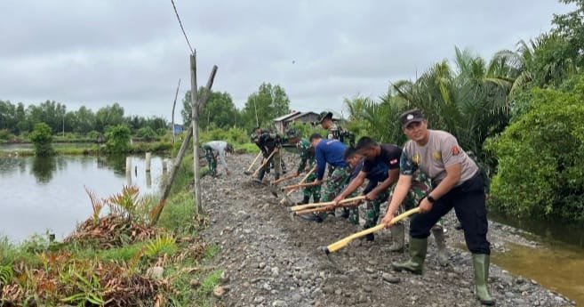 matabangsa.com – Medan | Selain pengerukan jalan, Satgas TMMD ke-126 Kodim 0201 Medan pada Rabu (15/10) juga fokus pada penguatan infrastruktur di kawasan pesisir Kelurahan Paya Pasir. Prajurit TNI bersama masyarakat bahu-membahu menimbun dan meratakan jalan tanggul yang membatasi tambak warga.