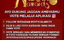 Ayo dukung dan pilih nominasi jagoan ambyarmu di ajang Ambyar Awards 2023 mulai tanggal 5 – 23 Juni 2023 melalui aplikasi RCTI+ dan Instagram di @officialmnctv. Untuk melakukan vote di Instagram @officialmnctv dengan cara follow Instagram @officialmnctv, pilih dan like foto kategori yang ingin kamu vote, vote dengan cara memberikan komentar di foto kategori pilihan dengan format : #VOTEAA2023(spasi)kode nominasi, dan satu akun berlaku untuk satu kali vote per hari dan dapat memberikan vote kembali di hari berikutnya.