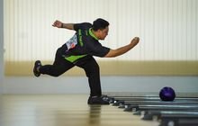 Peboling Jatim Billy Muhammad Islam melakukan selebrasi setelah berhasil melakukan lemparan strike pada pertandingan babak penyisihan grup – 1 single putra di Gor Dispora Sumut, Deli Serdang, Sumatra Utara, Pada Minggu 8/9/2024.