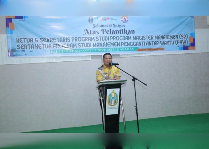 Matabangsa.com – Asahan : Fakultas Ekonomi Universitas Asahan (UNA) menggelar pelantikan Ketua dan Sekretaris Program Studi Program Magister Manajemen (S-2) serta Ketua Program Studi Manajemen Pengganti Antar Waktu (PAW) di Aula Fakultas Ekonomi UNA, Kamis (08/01/2026). Pelantikan ini dihadiri Wakil Bupati Asahan, Sekretaris Daerah Kota Tanjung Balai, Kepala Dinas Pendidikan Kabupaten Batu Bara, Ketua Pembina Yayasan UNA, Ketua Pengurus Yayasan UNA, Rektor Universitas Asahan, Dekan Fakultas Ekonomi beserta jajaran, serta tamu undangan lainnya.