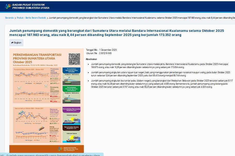 Data BPS Sumut terbaru Desember 2025. Peningkatan jumlah penumpang ini disebut berkaitan dengan meningkatnya kegiatan bisnis, perjalanan keluarga, serta program pemerintah yang mendorong pergerakan wisata di wilayah Sumatera Utara. Kualanamu sebagai pintu masuk utama wilayah ini kembali memperlihatkan perannya sebagai pusat transportasi udara paling sibuk di kawasan barat Indonesia.