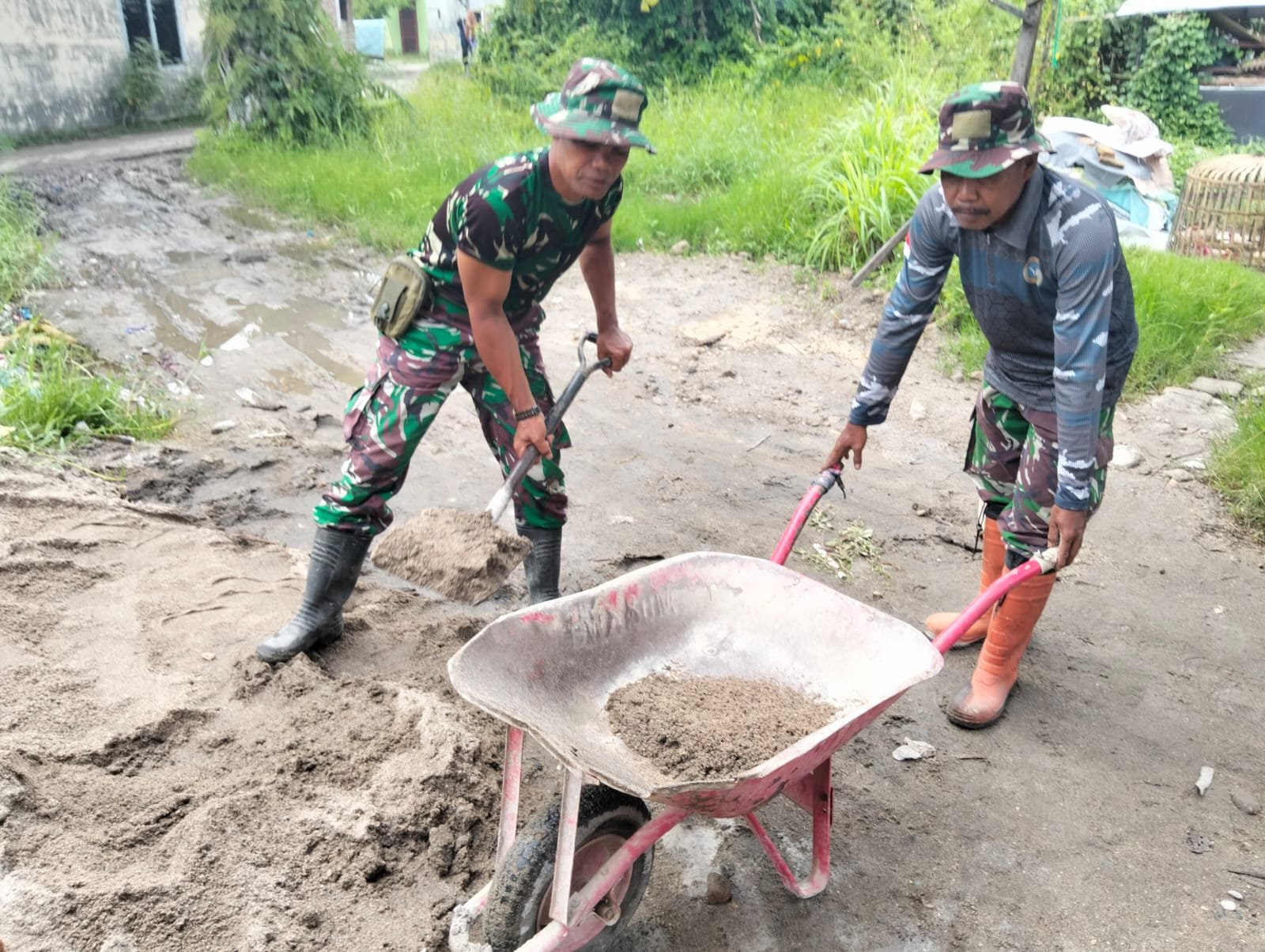 Rumah Bapak Anwar, yang selama ini hanya berdinding bambu dan berlantai semen rusak, kini mulai dipasangi dinding bata yang kokoh. Prajurit TNI bekerja di bawah cuaca mendung, tidak menyurutkan semangat mereka untuk segera mewujudkan hunian yang aman dan nyaman.