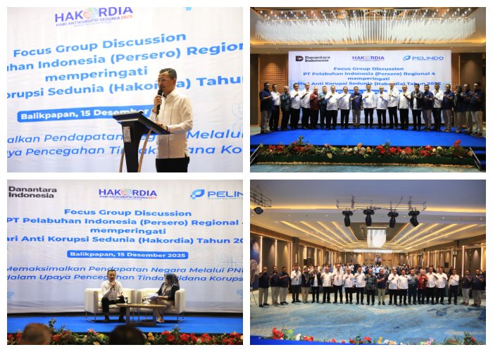 matabangsa.com – Balikpapan | PT Pelabuhan Indonesia (Pelindo) Regional 4 memperingati Hari Anti Korupsi Sedunia (Hakordia) Tahun 2025 dengan menggelar Focus Group Discussion (FGD) bertema “Memaksimalkan Penerimaan Negara Bukan Pajak (PNBP) pada Jasa Kepelabuhanan yang Diusahakan oleh PT Pelindo (Persero)”. Kegiatan ini berlangsung di Hotel Jatra Balikpapan dan dihadiri berbagai pemangku kepentingan strategis.