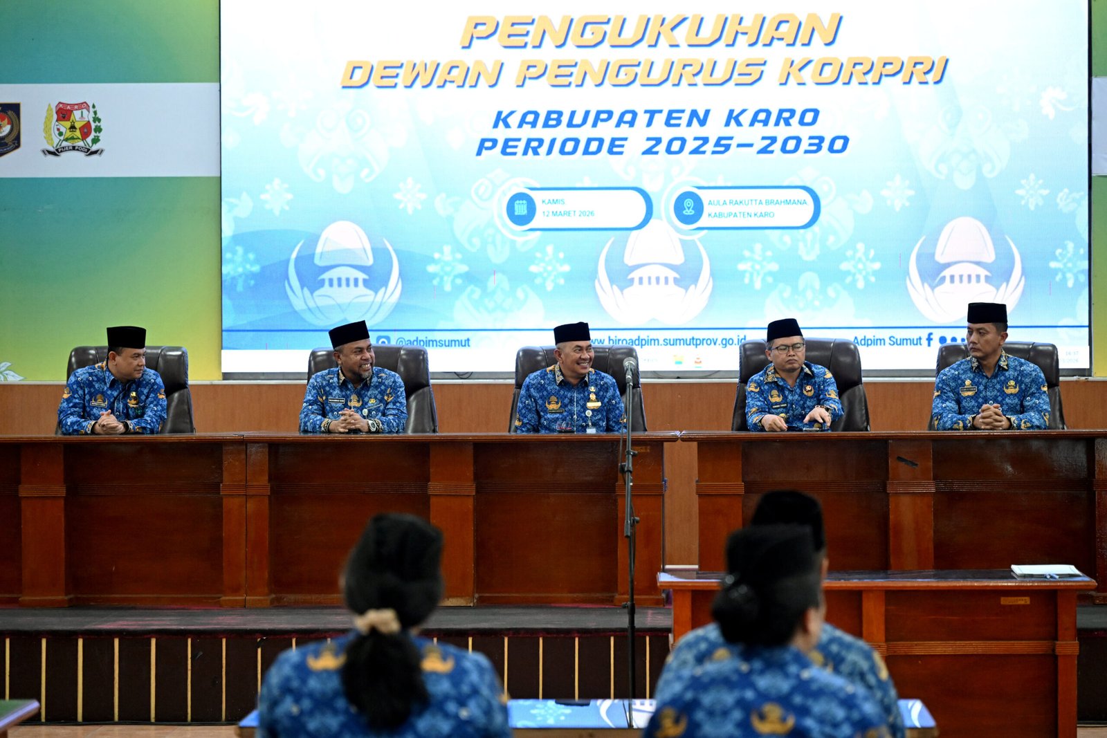KARO — Penjabat (Pj) Sekretaris Daerah Provinsi (Sekdaprov) Sumatera Utara (Sumut) Sulaiman Harahap mengukuhkan Ketua Dewan Pengurus Korps Pegawai Republik Indonesia (Korpri) Kabupaten Karo. Kegiatan tersebut berlangsung di Aula Rakoetta Brahmana, Kantor Bupati Karo, Jalan Jamin Ginting, Kabanjahe, Kamis (12/3/2026).