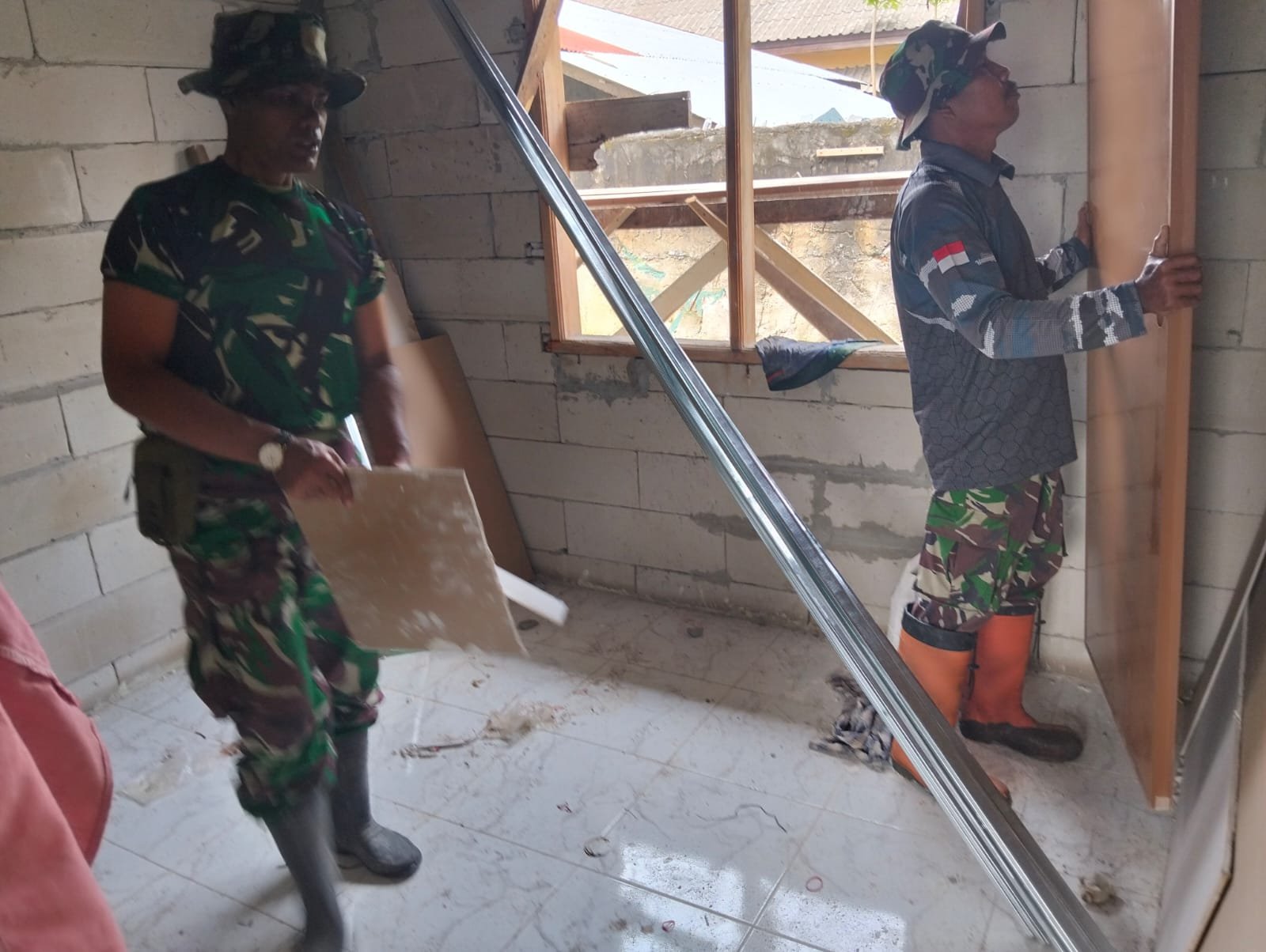 Mereka saling membantu mengangkat bahan bangunan, menata keramik, dan membersihkan lokasi kerja. Sinergi TNI-Polri ini menjadi contoh kerja sama yang solid di lapangan.