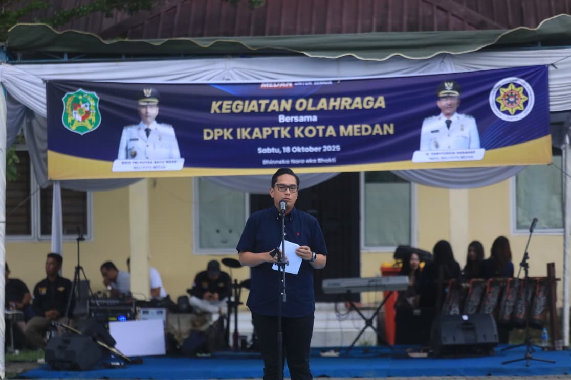 Semangat kekeluargaan begitu terasa dalam kegiatan olahraga bersama yang digelar Dewan Pengurus Kota (DPK) Ikatan Keluarga Alumni Pendidikan Tinggi Kepamongprajaan (IKAPTK) Kota Medan di lapangan Cadika Medan, Sabtu (18/10/25).