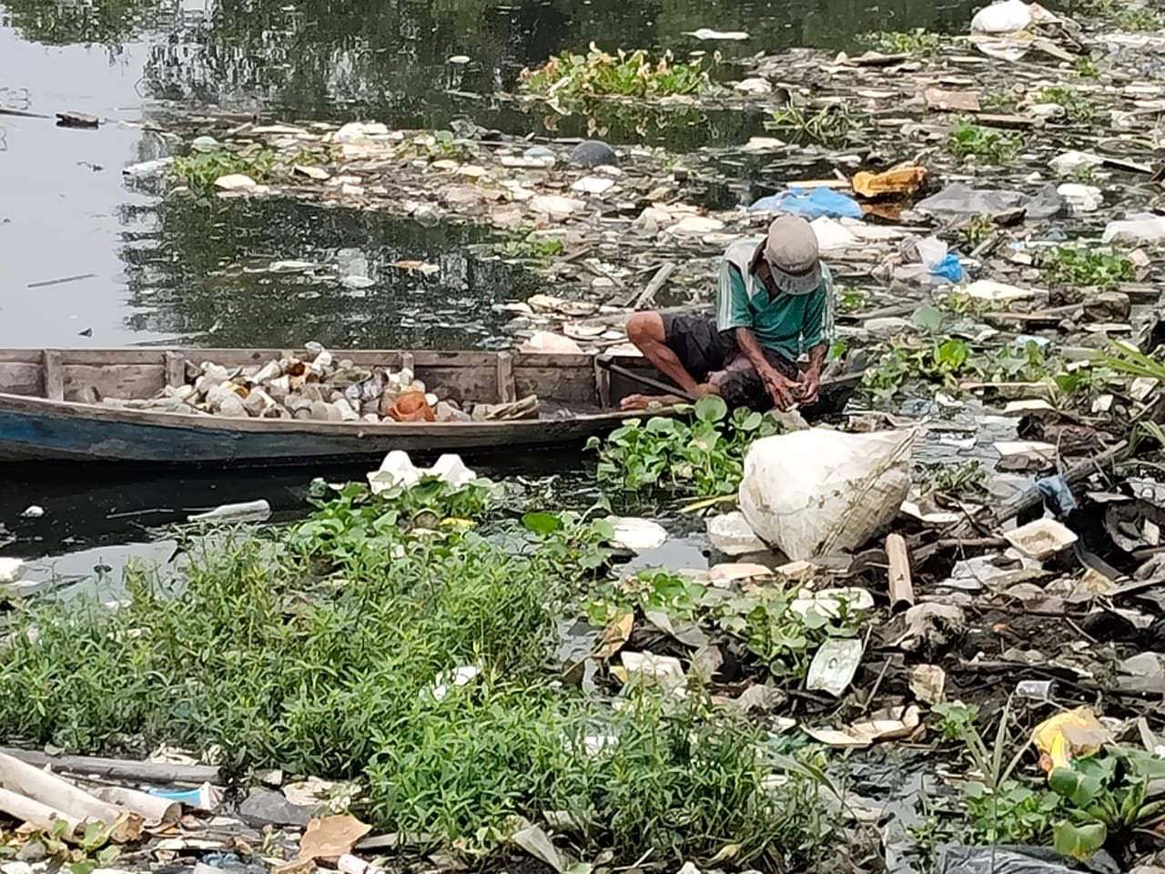 Dengan sampan kecil dan dayung kayu, Sabri berkeliling setiap pagi. Ia mengumpulkan plastik dan botol yang terapung di permukaan air.