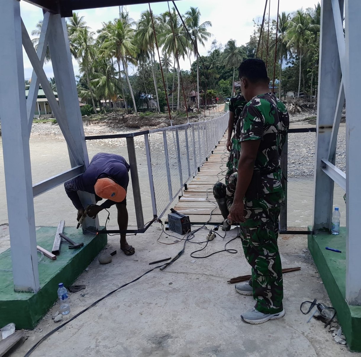 Pada tahap akhir pengerjaan, personel juga melaksanakan pemasangan pagar jembatan serta pengecatan pagar, papan jembatan, tembok, dan lantai pondasi sebagai bagian dari proses finishing konstruksi agar jembatan lebih aman dan memiliki daya tahan yang baik. Pekerjaan tersebut didukung dengan peralatan berupa cangkul, sekop, angkong, linggis, serta satu unit alat berat excavator.
