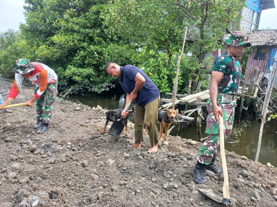 Warga terlihat antusias membantu pekerjaan yang dilakukan para prajurit. Mereka membawa peralatan seadanya dan ikut menimbun bagian jalan yang masih bergelombang agar lebih rata dan kuat.