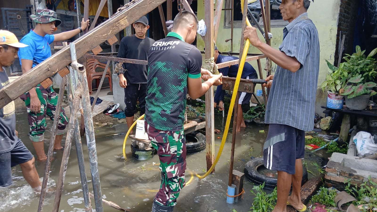 Meskipun area kerja tergenang air, tidak satu pun anggota Satgas maupun warga tampak mengeluh. Mereka terus bekerja dengan penuh tanggung jawab hingga pipa utama terpasang. Warga juga saling bergantian membantu memegang alat pengebor agar tetap seimbang.