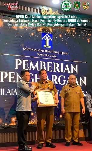 Penghargaan tersebut diserahkan langsung oleh Plh. Kepala Kantor Wilayah Kementerian Hukum Sumatera Utara, Ferry Ferdiansyah, S.H., M.H., kepada Sekretaris DPRD Kota Medan, Muhammad Ali Sipahutar, S.S.T.P., M.A.P., selaku Pengelola JDIH DPRD Kota Medan, Selasa (10/02/2026) .