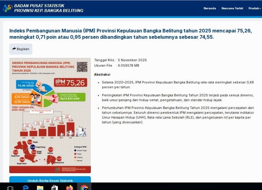 matabangsa.com – Medan| Dimensi standar hidup layak dalam Indeks Pembangunan Manusia (IPM) Provinsi Kepulauan Bangka Belitung menunjukkan peningkatan pada tahun 2025. Badan Pusat Statistik (BPS) Provinsi Kepulauan Bangka Belitung dalam rilis 5 November 2025 mencatat bahwa rata-rata pengeluaran riil per kapita per tahun yang disesuaikan meningkat sebesar Rp170 ribu atau naik 1,24 persen dibandingkan tahun sebelumnya.