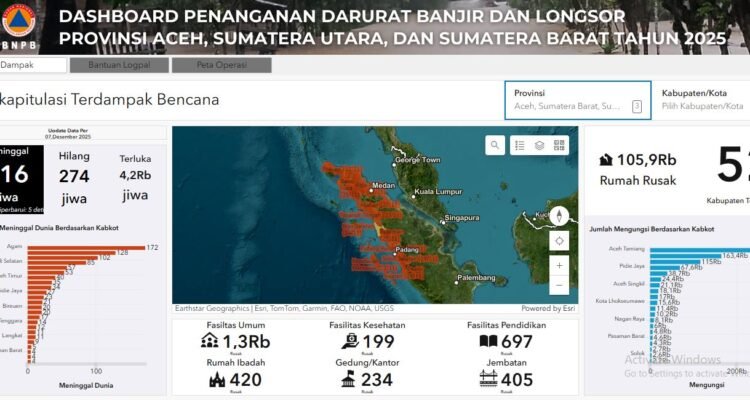 Data BNPB Terkini Banjir Menutup Akses 52 Kabupaten: 405 Jembatan dan Ribuan Fasilitas Umum Rusak ParahAceh, Nasional, Sumbar, Sumut|Desember 7, 2025Desember 7, 2025oleh Dave Santomatabangsa.com – Medan |Kerusakan infrastruktur menjadi fokus utama penanganan bencana setelah banjir