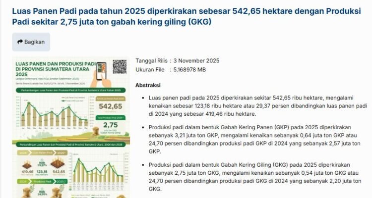 BPS Sumut Luas Panen Padi Sumut Naik 29,37 Persen pada 2025, Produksi Ikut TerdongkrakEkonomi, Nasional, Sumut|Desember 8, 2025Desember 8, 2025oleh Dave Santomatabangsa.com – Medan | BPS Sumut mencatat peningkatan signifikan pada luas panen