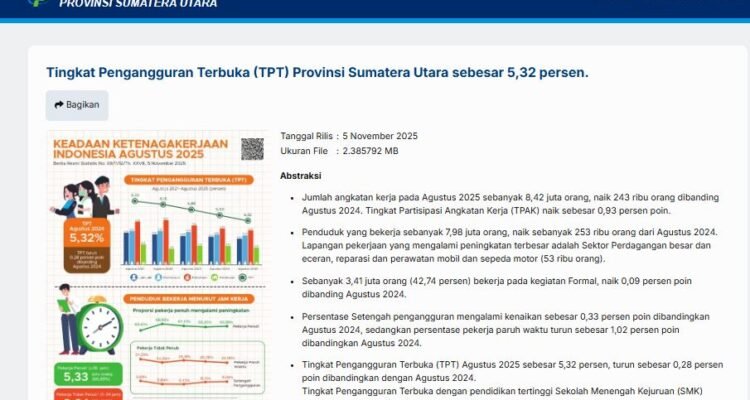 BPS Sumut Pekerja Formal Sumut Naik Tipis, Setengah Pengangguran Justru MeningkatEkonomi, Nasional, Sumut|Desember 8, 2025Desember 8, 2025oleh Dave Santomatabangsa.com – Medan | Struktur ketenagakerjaan di Sumatera Utara mengalami perubahan signifikan