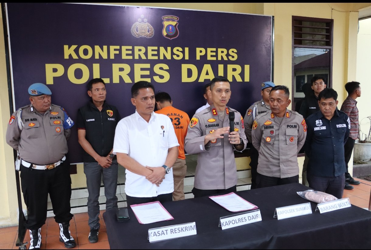Kapolres Dairi, AKBP Otniel Siahaan, S.I.K., M.I.K dalam konferensi pers mengatakan, tersangka yang diamankan berinisial DL (22) warga Desa Pengambatan Kecamatan Merek Kabupaten Tanah Karo.