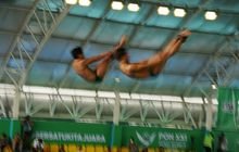 1. Pasangan atlet loncat Synchro Papan 3 Meter DKI Jakarta melakukan loncatan pada bertanding final Final Loncat Indah Synchro Putra papan 3 Meter PON XXI Aceh – Sumut di Kolam Renang Selayang, Medan, Sumatera Utara, Minggu (8/9). PB PON XXI SUMUT/RISKY CAHYADI