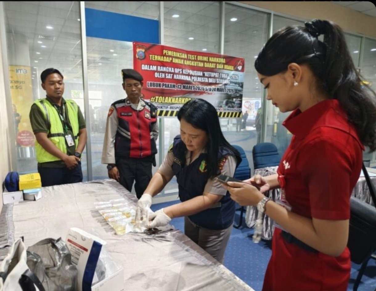matabangsa.com-DELISERDANG: Dalam rangka kegiatan Operasi Ketupat Toba Tahun 2026, Polresta Deliserdang bekerjasama dengan Officer In Charger (OIC) Bandara Kualanamu, Avsec menggelar test urine kepada Pilot, Co-pilot, pramugari maskapai penerbangan dan Supir Bus di Bandara Internasional Kuala Namu, Rabu (18/3/2026).