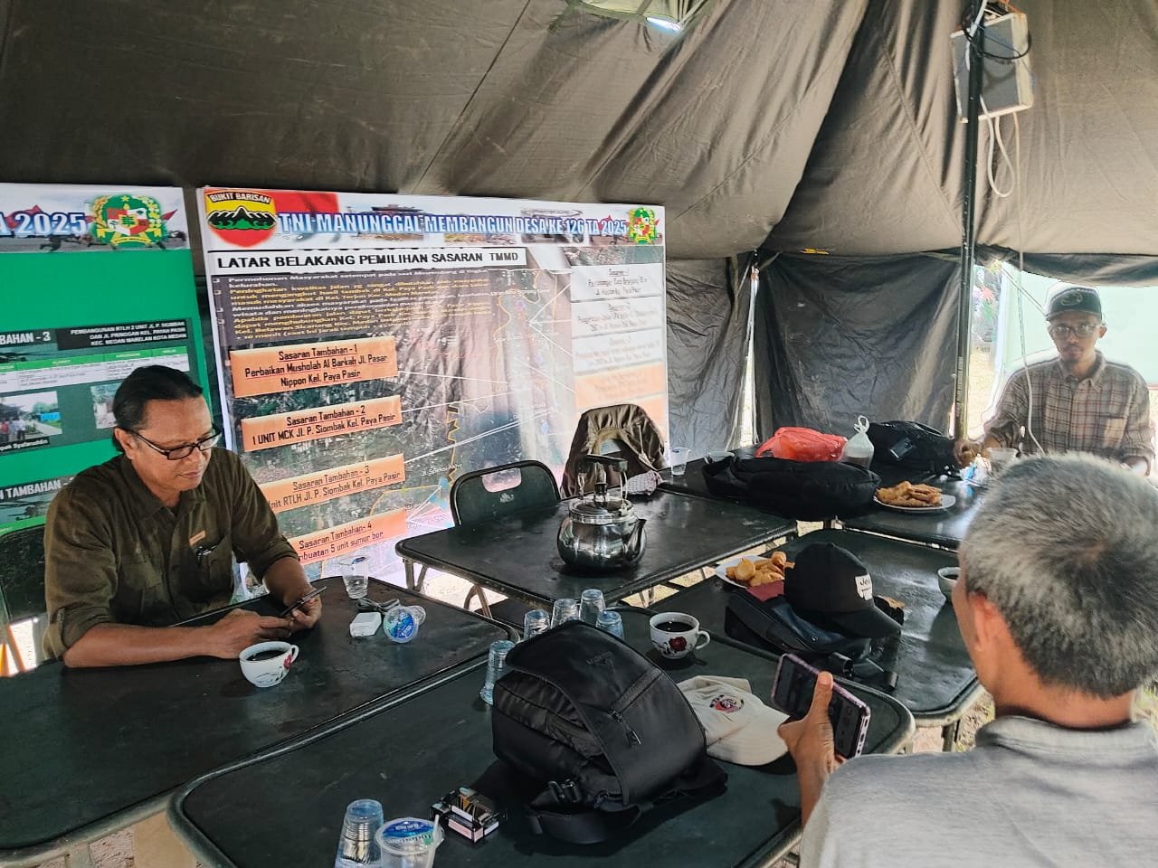 Dalam diskusi hangat di dalam tenda, para jurnalis dan anggota Satgas saling bertukar pandangan mengenai perubahan sosial yang mulai terasa di masyarakat, Sabtu 11 Oktober 2025.