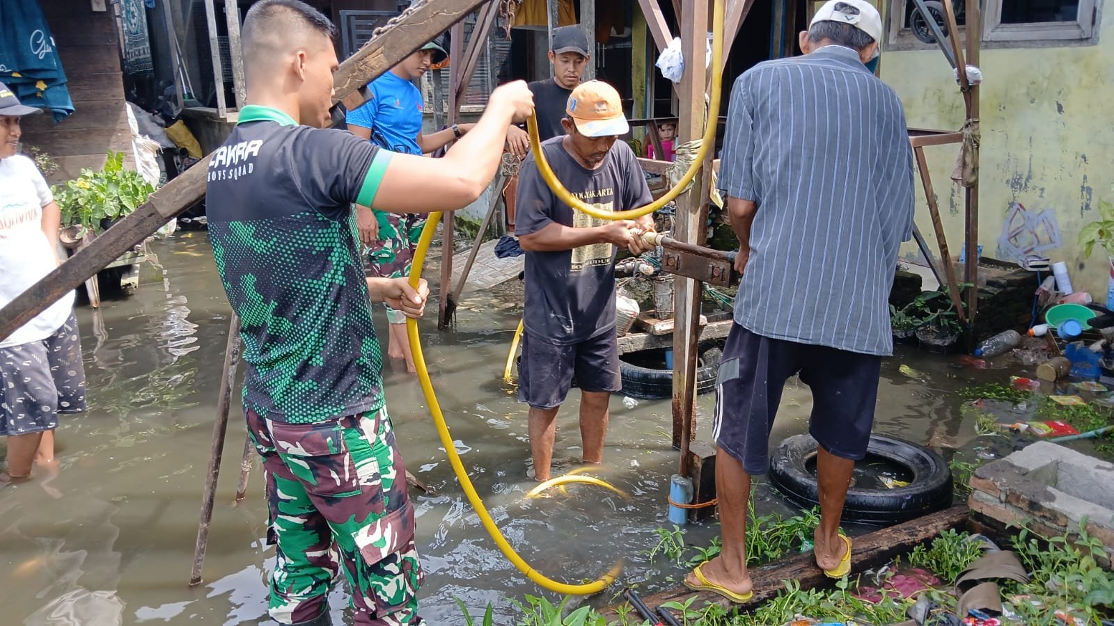 matabangsa.com – Medan: Suasana gotong royong mewarnai kegiatan pemasangan sumur bor di Jalan Penghulu Lama, Lingkungan 08, Kelurahan Paya Pasir. Satgas TMMD ke-126 Kodim 0201/Medan bersama warga bekerja dengan penuh semangat di tengah genangan air. Kegiatan ini menjadi upaya bersama dalam menyediakan sumber air bersih bagi masyarakat setempat.