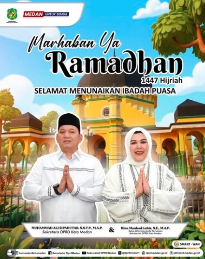 Sekretaris DPRD Kota Medan, Muhammad Ali Sipahutar, S.S.T.P., M.A.P., bersama Ketua Dharma Wanita Persatuan Sekretariat DPRD Kota Medan, Rina Muhammad Ali Sipahutar, menyampaikan ucapan selamat menunaikan ibadah puasa Ramadhan 1447 Hijriah kepada seluruh masyarakat, Rabu 18/02/2026.