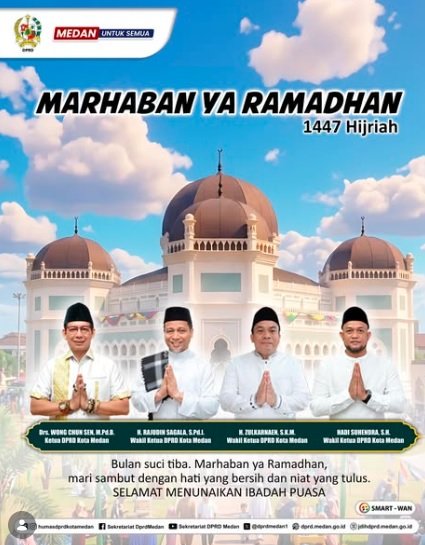 Pimpinan dan Anggota DPRD Kota Medan secara bersama-sama menyampaikan ucapan Marhaban ya Ramadhan, selamat menunaikan ibadah puasa Ramadhan 1447 Hijriah/2026 kepada seluruh masyarakat Kota Medan.